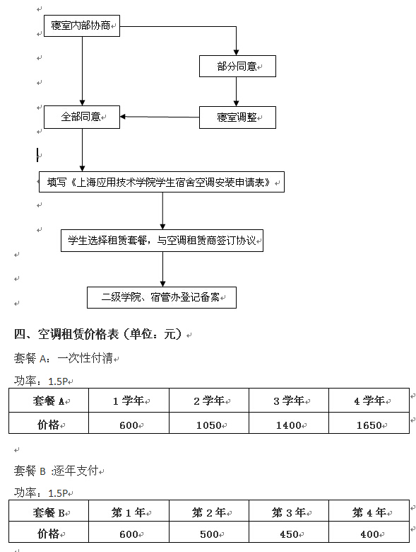 寝室所有成员达成一致意见后,网上下载或现场填写《上海应用技术学院学生宿舍空调租赁安装使用申请表》,一式三份。学生、学生所在学院、宿管办各一份进行存档备案。服务商按预约时间进行空调安装。由此所产生的租赁费、押金、电费等由寝室成员协商分摊。未经许可自行调换寝室而产生的问题由调换者本人承担。