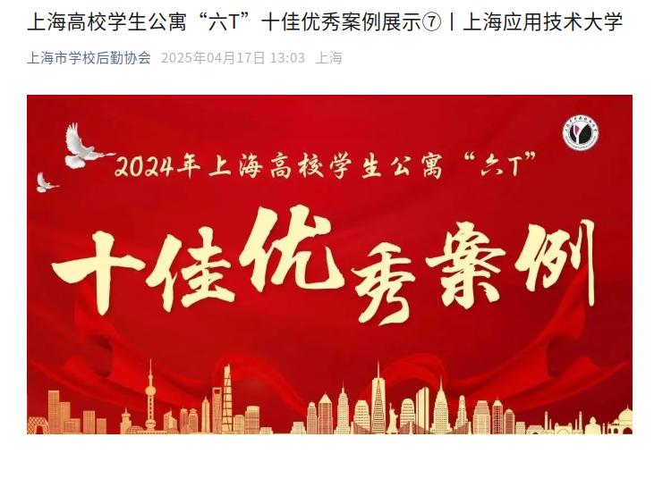 4月17日,上海市学校后勤协会推送了上海高校学生公寓“六T”十佳优秀案例展示——上海应用技术大学,展示了我校“五星级示范学生公寓”六T创建工作。