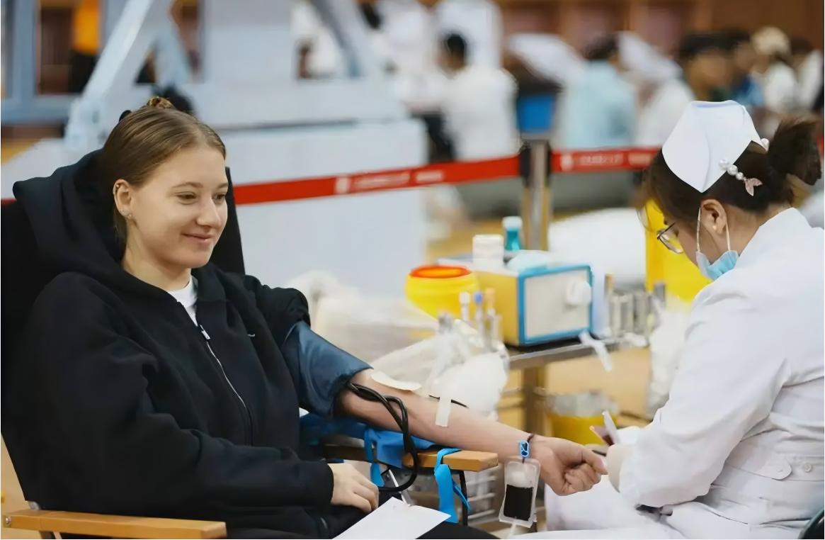 献血者脸上洋溢着坚定与自豪,在现场完成系列检查后,依次挽起衣袖,以爱心之名,赴热血之约。人文学院的崔保贵说:“作为一名学生党员,带头参与无偿献血是用实际行动践行党的宗旨,发挥先锋模范作用,传递正能量。献出的是爱心与温暖,展现的是新时代青年的使命与担当。这是我第三次参加无偿献血,我为能给社会公益事业贡献自己的力量而自豪!”来自智能技术学部计算机学院俄罗斯留学生玉明说:“这是我在中国的第一次公益志愿活动,虽然有点害怕,但是很开心能够用自己的行动去帮助他人,后续我还会继续用自己的行动去帮助更多的人,我爱我的大学同学。”