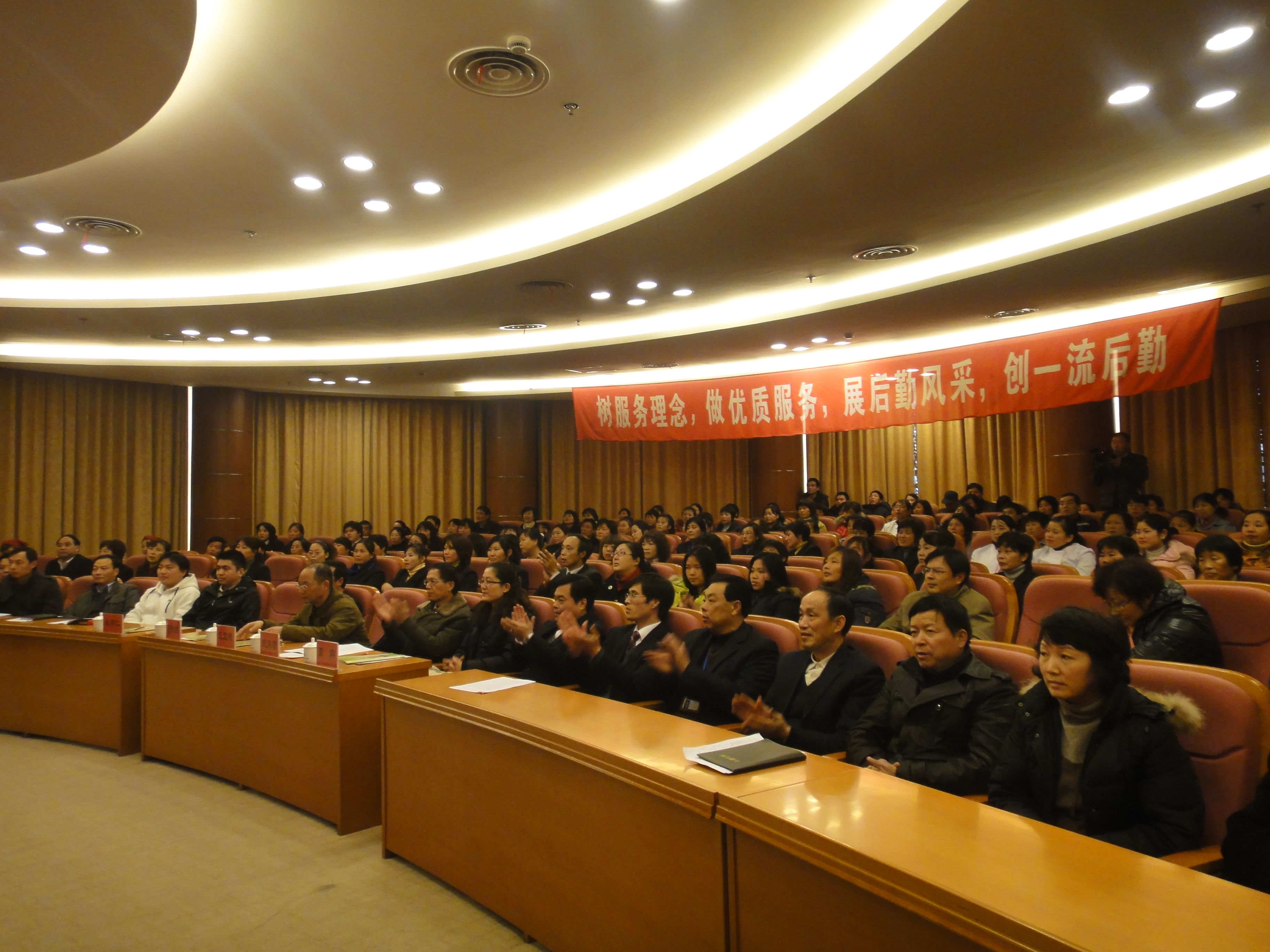 行政楼117会议室,我校各食堂服务人员代表、物业公司人员精神抖擞、身穿工作制服,组织有序的等待市教卫等领导前来指导工作。与高书记共同前来出席我处后勤服务活动的还有市教卫党委副秘书长曹荣瑞、上海高校后勤股份有限公司董事长林炳华、市教委后勤保卫处处长王立慷、市教委后勤保卫处(正处级调研员)沈永明,市教育后勤管理中心党委书记及上海高校后勤服务中心主任沙德银等高校后勤服务中心部门负责人。