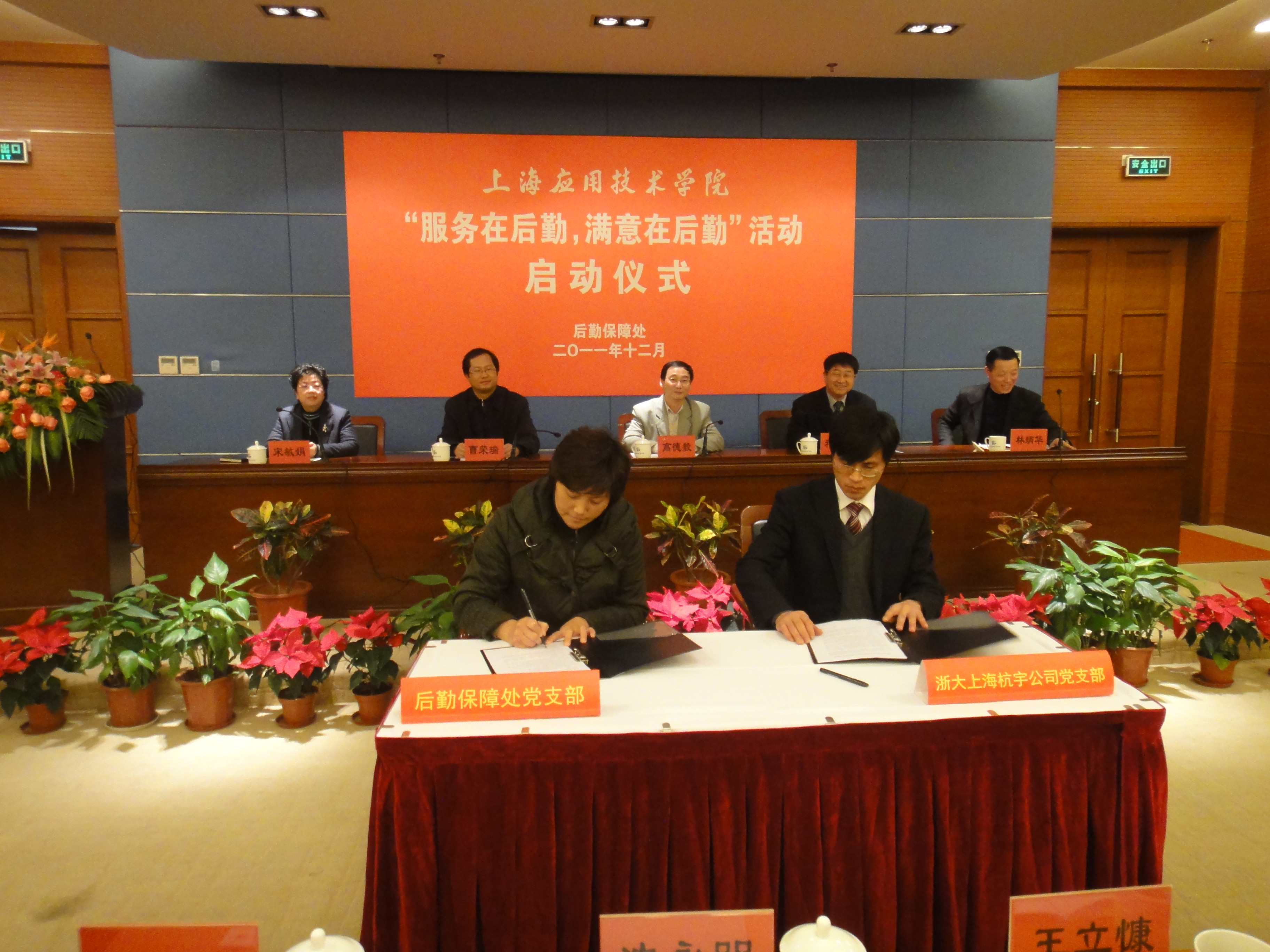 后勤保障处副处长马莹主持会议,校党委副书记宋敏娟动员讲话并提出:“积极推进后勤服务人员队伍建设,切实提高后勤服务人员的服务意识、服务水平和服务质量,努力为师生员工提供更为优质的服务,让师生满意,使学校放心,为学校的新一轮发展做出后勤人应有的贡献”。校后勤服务中心总经理王忠成、浙大上海杭宇公司总经理王桂华先后做工作总结发言。市教卫党委副书记与我校党委书记祁学银特为后勤服务岗位先进党员授“党员示范岗”挂牌,并共同为“服务示范窗口”进行揭牌。为创党员示范岗、后勤服务示范窗口,展后勤风采,会上学校机关总支(第十二支部后勤保障处)与浙大新宇上海公司支部、学校后勤服务中心支部分别签约,共同开展创先争优活动。在众人的见证下,员工代表宣读倡议书,双方完成党支部结对共建签约仪式。