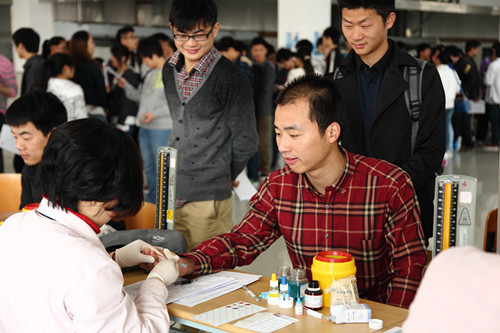 4月26日、27日,2013年无偿献血活动在奉贤校区第二食堂二楼进行,我校老师和同学们爱心涌动,积极响应。此次共有1027名师生参加,有效缓解了上海临床用血的紧张,向社会贡献了应技师生的满满爱心。