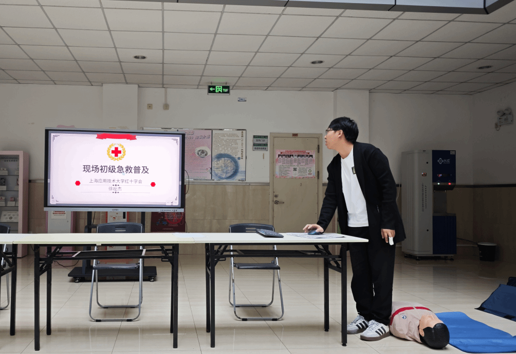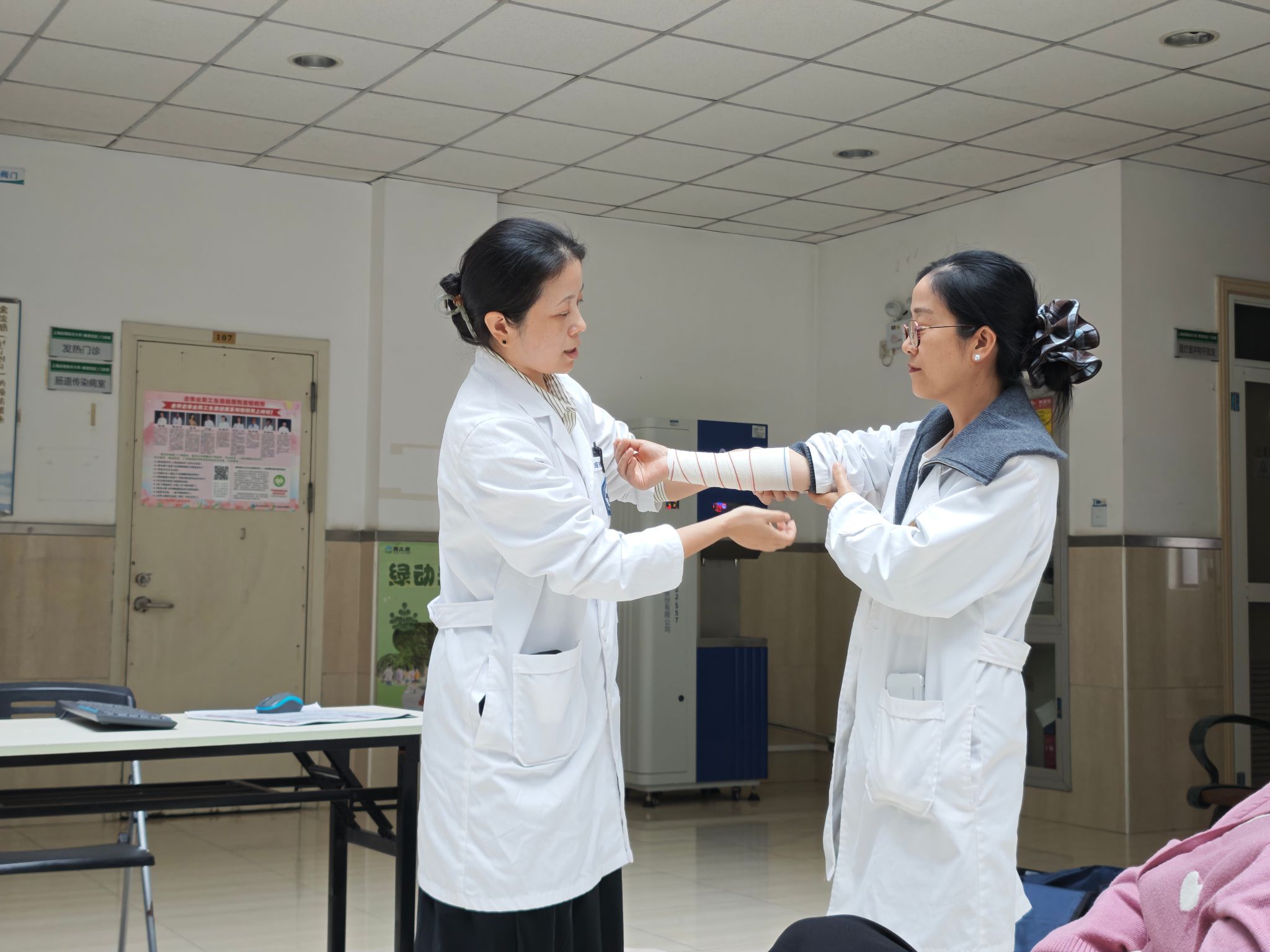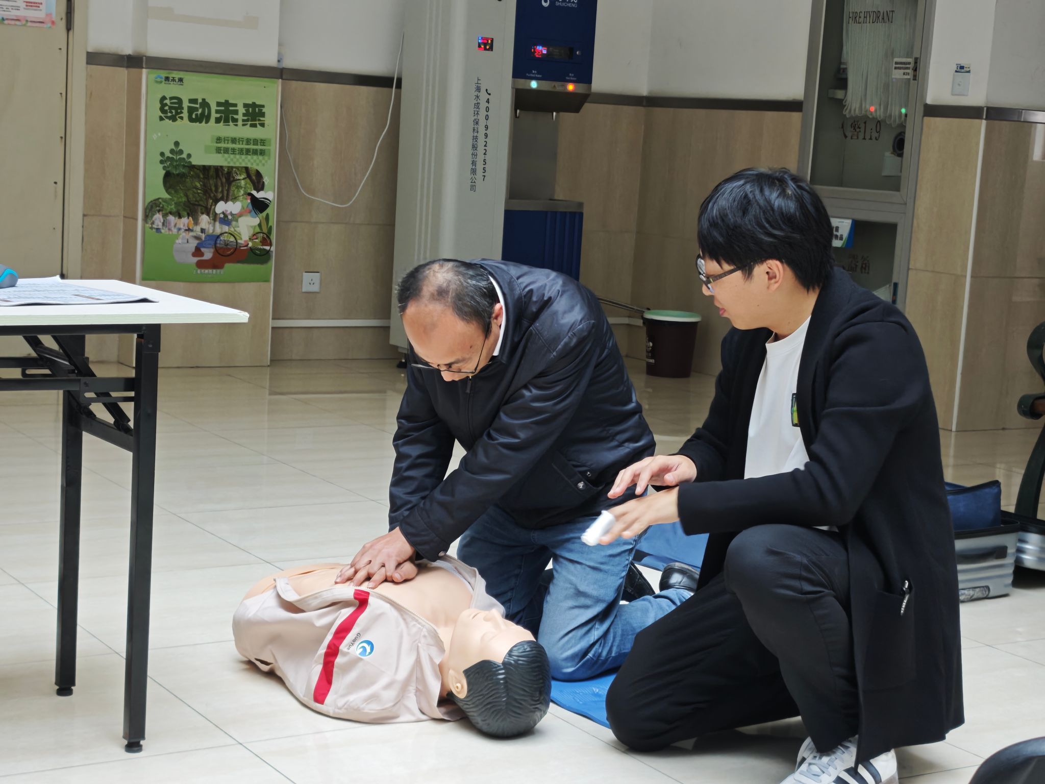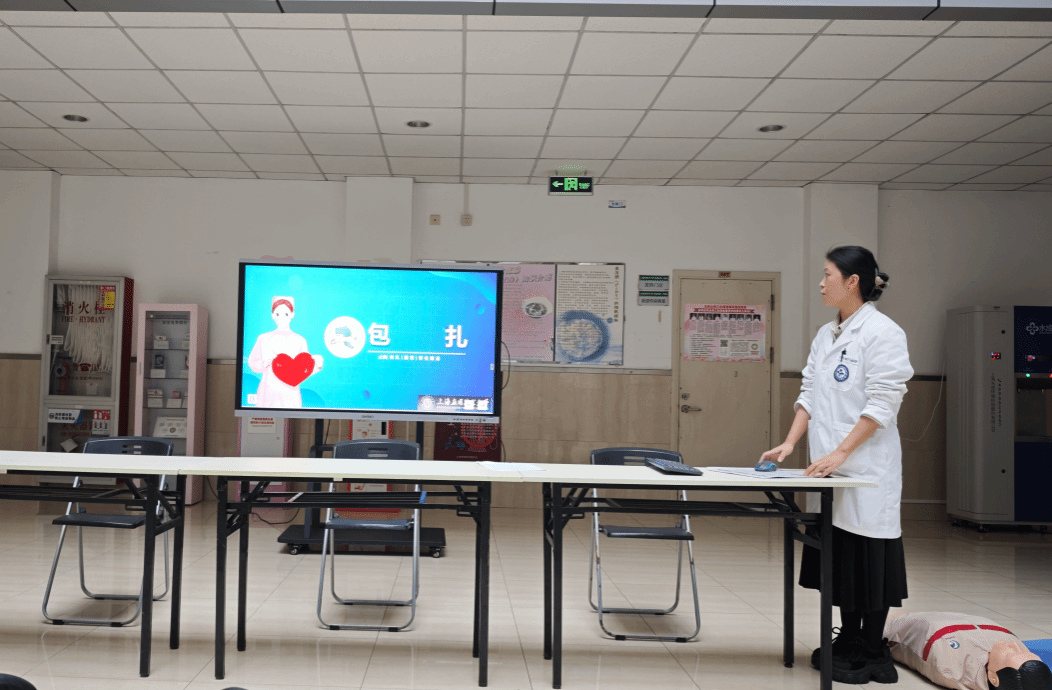 培训会上,门诊部护师屈敏与校红十字会指导老师徐祉杰,分别就外伤包扎和急救知识进行了介绍和实操。屈敏通过讲解包扎正确与否的利弊,强调正确的包扎是外伤现场应急处理的重要措施之一。在讲解之余,屈敏为大家现场演示了几种包扎手法,增加实操性。徐祉杰详细讲解了应急救护的基本知识概述与AED普及现状,通过各场景下生动案例展示,以及现场进行心肺复苏、人工呼吸、海姆利克急救法等模拟实操救治,让大家感受到掌握应急救护的重要意义。活动现场增加了急救知识问答和模拟实操训练环节,力争让参与者都能掌握急救技能。